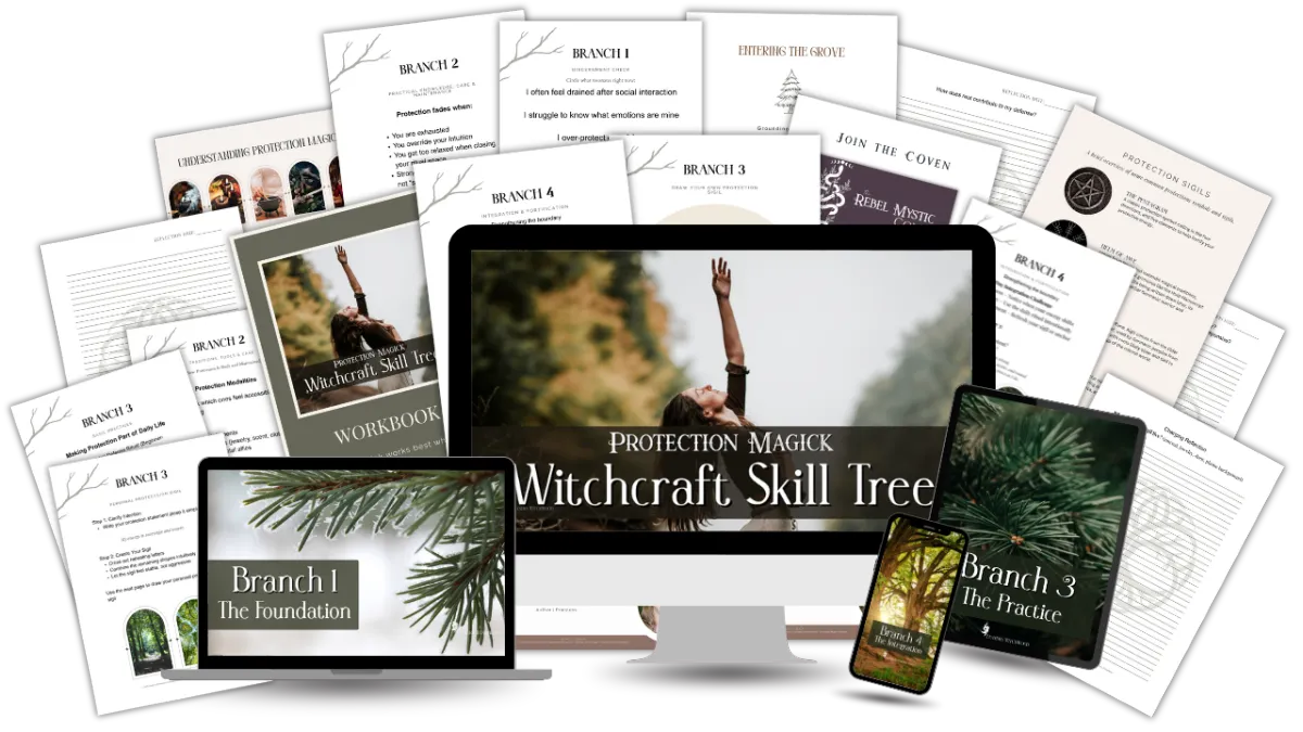 The Rebel Mystic Witchcraft Skill Trees are a modular, intentional way to learn witchcraft without overwhelm. Each tree is a focused path of study, designed to give you clarity, confidence, and embodied understanding of a single magickal topic — while gently guiding you toward more profound mastery when you’re ready.